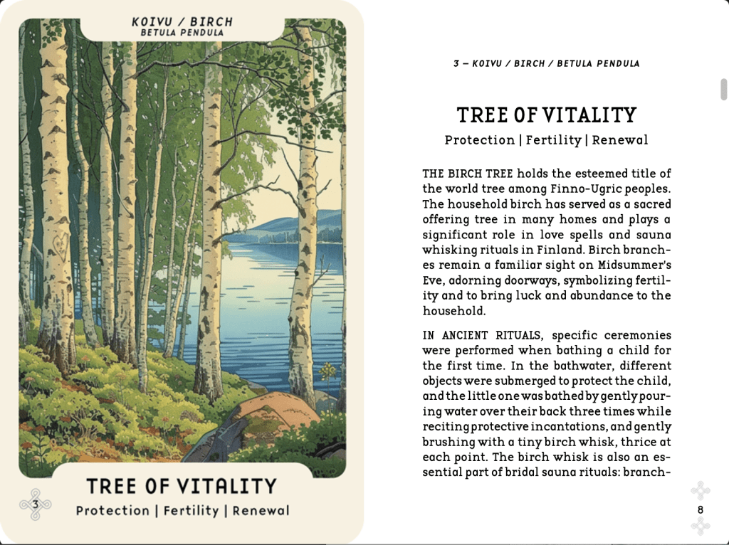 The content of the cards emerges from the depths of our childhood landscapes, the Finnish forest, its trees, plants, spirits, and animals, as well as the stories hidden within the forest’s embrace. The cards and a digital booklet which come with the cards draw their content from Reetta’s latest book, “Timeless Nordic Rituals,” which was released last autumn in Finland and has just been sold to Germany.